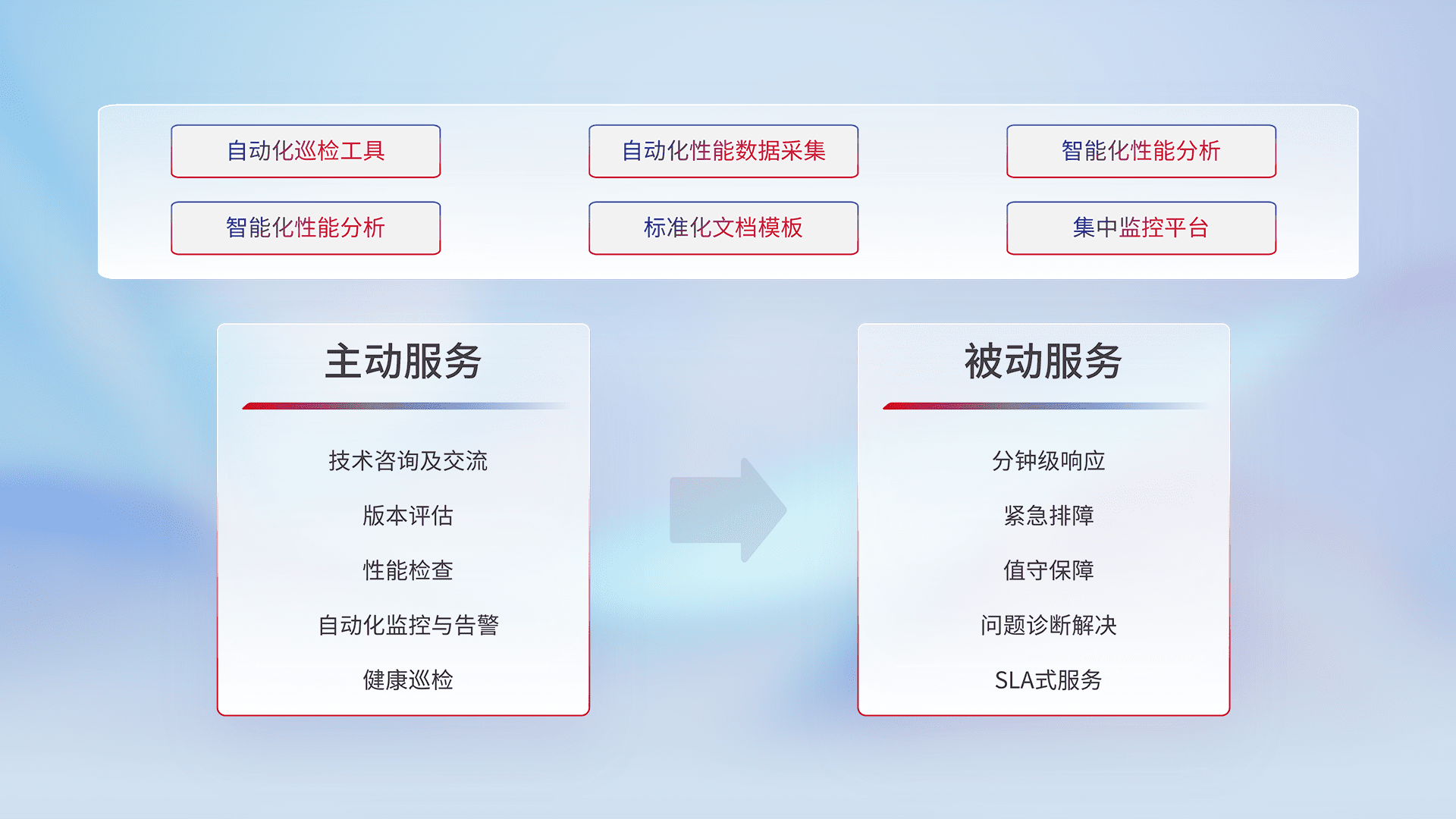 智能化工具和标准化文档,,保障服务质量,,提供主动服务(包含技术咨询、、、、版本评估、、、性能检查、、、自动化监控与告警、、健康巡检)和被动服务包含(分钟级响应、、、、紧急排障、、、、值守保障、、、问题诊断解决、、、SLA服务)。。。。